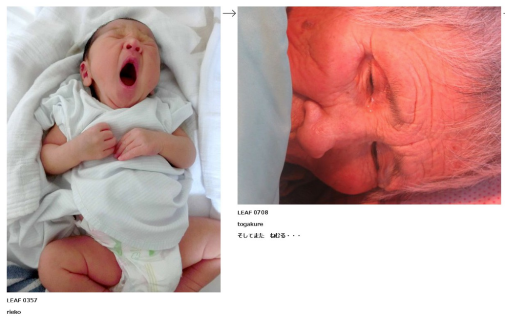 月の長時間露光の写真に、赤ちゃんの写真が繋がって。そこから、おばあさんの写真になるんですよ。「そして、またねむる」っていうタイトル。なんかね、多分、もう少しで命が途切れそうなおばあちゃんの流れなんですよね。